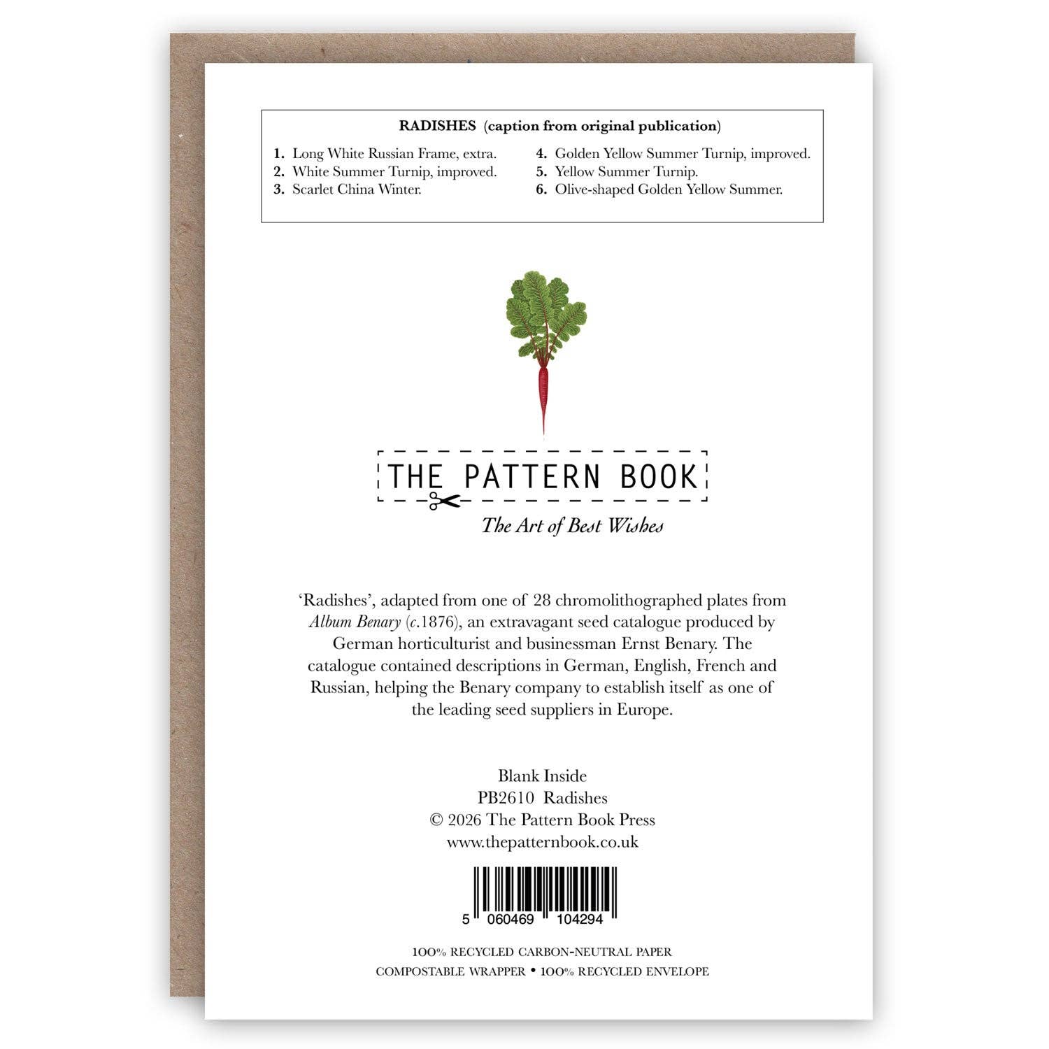 Greeting card depicting different types of radish. Printed in England on a light cream, 300gsm carbon-neutral Italian paper, made from 100% recycled post-consumer waste.